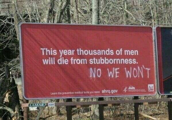 This ad suggests that men refuse to go to the doctor to get medical attention. They die as a result. The people who saw the sign refused to believe that.