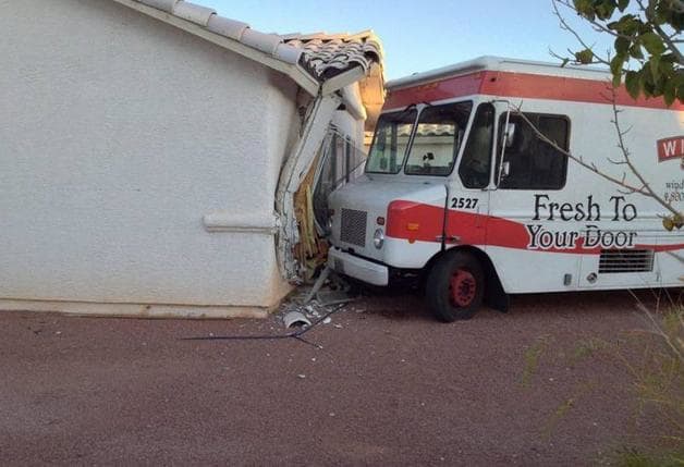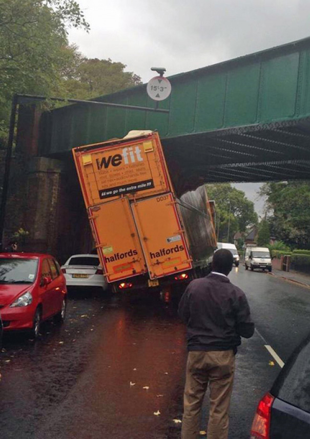 Looks like “We Fit” doesn’t quite…fit. It also looks like the driver didn’t double check their clearance before attempting to take it under this 15’3″ bridge that’s clearly marked.