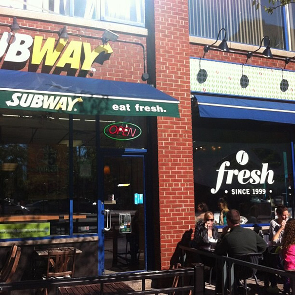 This funny placement makes it look like Subway is encouraging people to eat at their neighboring competitors. By the looks of the crowd on the patio, we’d have to say it’s working.