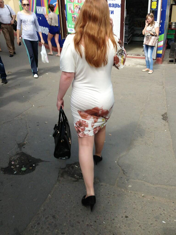 The red flowers on this woman’s dress have some absolutely terrible placement. It really makes it appear as if this woman had an accident and is walking around without knowing about it. Maybe someone should tell her?
