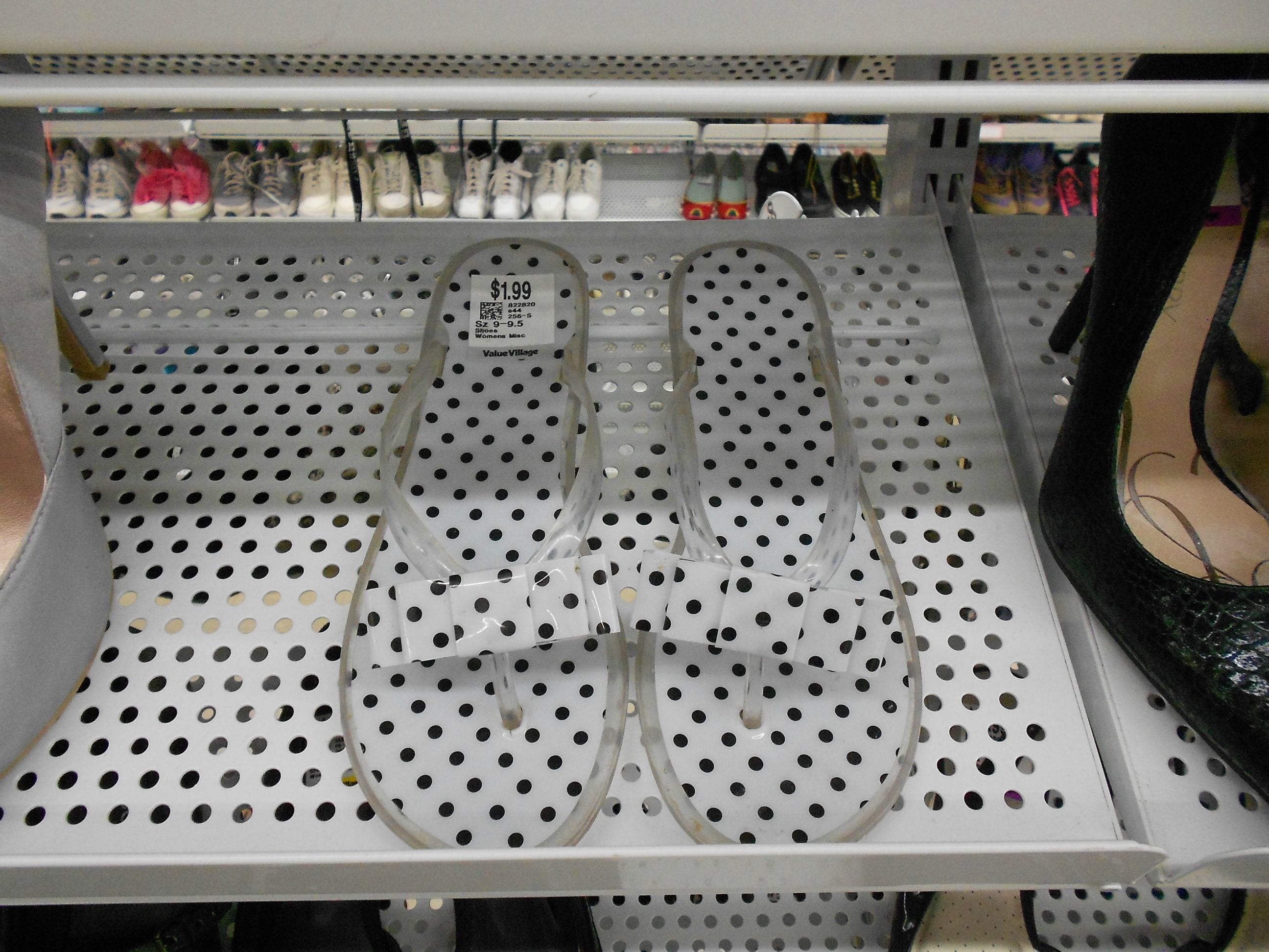Can you see them? These are black and white polka dot flip flops. But you can barely see them against this background.