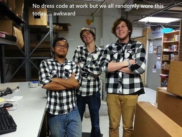 Their job doesn’t have a “must wear black and white plaid” dress code. But they all wore the same shirt. They must have a bro-hive mind thing going on.