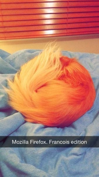 Meet Mozilla Firefox Francois. He’s a dog. But he looks like the Mozilla Firefox icon in this position with his floofly tail.