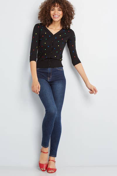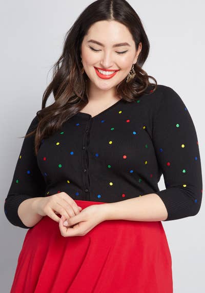 24. A rainbow dotted cardigan that’ll match everything you own (and look darn cute buttoned up like a top, too).