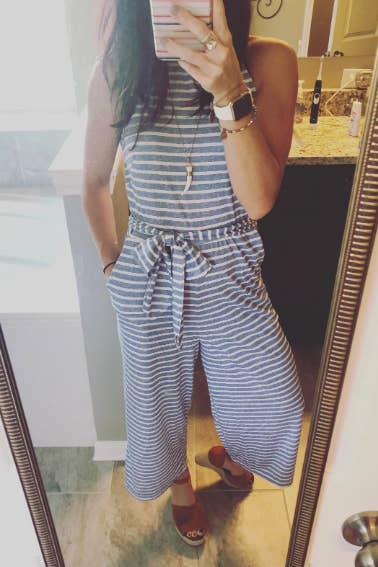 8. An effortlessly chic striped jumpsuit you’ll rock all spring, summer, and fall long. Toss a jacket or a sweater over it now, then pair it with cute jewelry and sandals when it warms up!