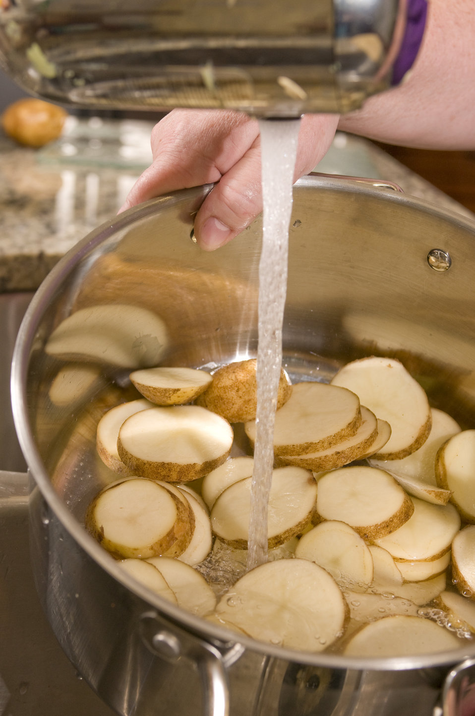 1. Start by layering half your meat, potatoes and onion together in a Dutch oven.