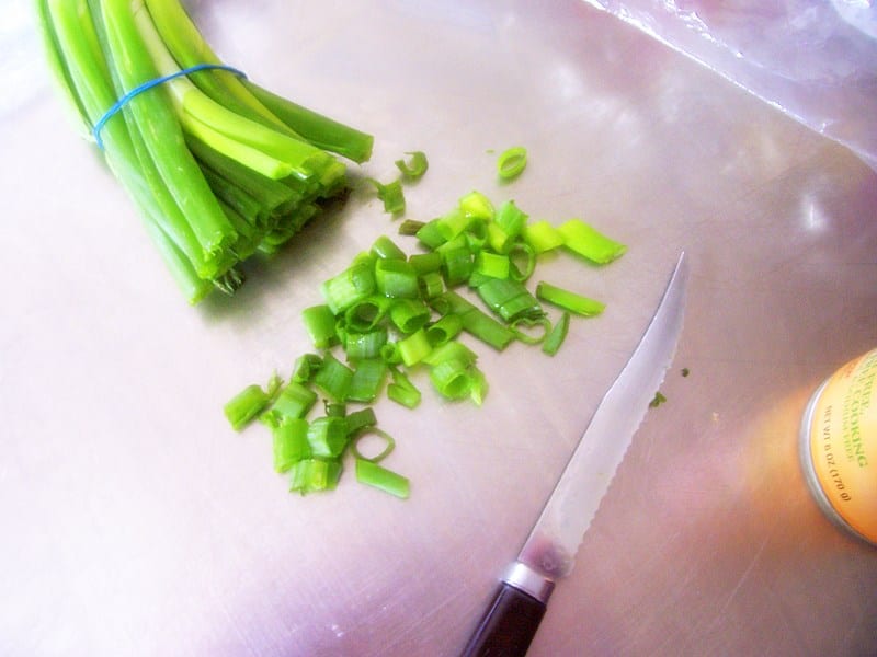 6. Add your cream of chicken soup along with chilis, corn, green onions and a cup of cheese. Stir it up well and set it aside.