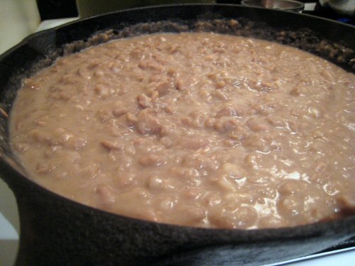 3. Put your chips in a greased baking dish. In a side bowl, stir up your refried beans and spread them on top.