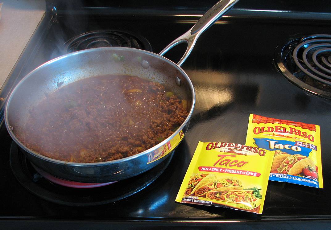 2. Stir in your taco seasoning and water and keep cooking and stirring for three minutes. When it thickens, set it aside.