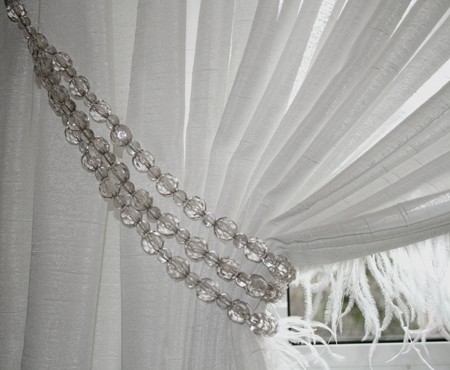 Want your home to look like a palace. Make your curtain tie backs count. You can buy crystal bead curtain tie backs or use an old necklace. A nice ribbon with leftover chandelier pieces will do too.