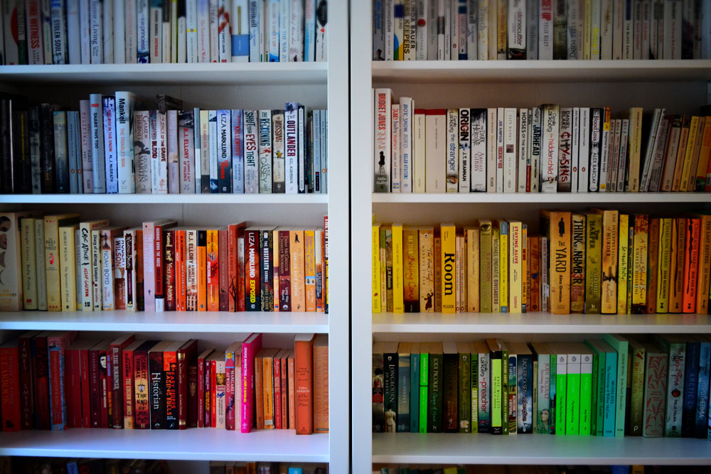 Create a real focal point in your home with a little reorganizing. No purchase necessary. All you have to do is reorganize the books on your shelf in color order. It looks super pretty. Find tips on how to get started here.