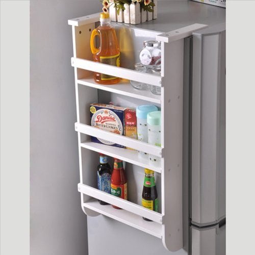 Perhaps your fridge isn’t positioned between two walls. If that’s the case, you might want to consider hanging an extra shelf on the exposed side of the fridge. It looks great, gets rid of the dull refrigerator look and saves you some space.