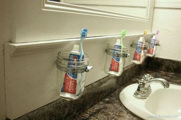 With multiple people in the same house, it can be quite a task to find your toothbrush and your toothpaste, and having holders standing in the bathroom looks a bit cluttered. What if you could hang holders for every person instead? You could even use simple mason jars as bathroom holders.