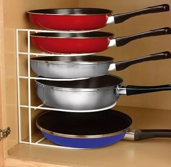 Free room in kitchen cabinets is limited, and while you might have some success by stacking pans on top of each other – the end result is often an even bigger mess. Luckily, you can buy pan organizers that will let you stack your pans in an efficient and stressfree manner.