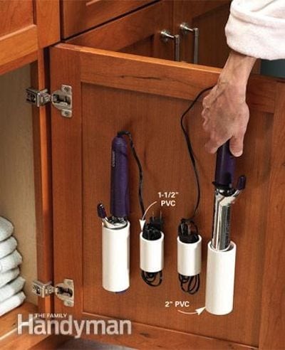 There are plenty of bathroom items that can make a bit of a mess in closets. Curling irons are just a perfect example of that, especially when they’re accompanied by a pretty long electrical cable that is just doomed to end up tangled. Attach some PVC pipes to the inside of a bathroom closet, and you’ve just built yourself a perfect and nifty spot for these annoying items. And best of all, you can even use it for cable management purposes as well!