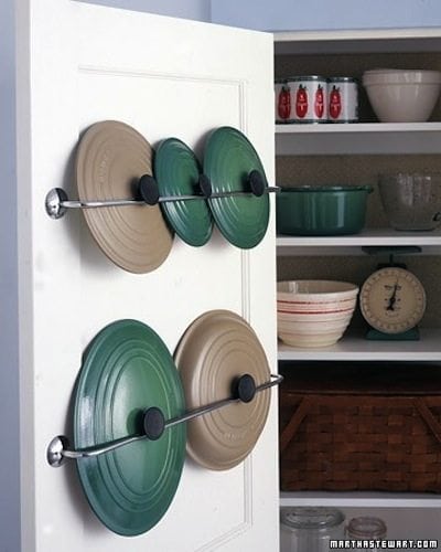 Stacking pots inside of kitchen cupboards seem like a good idea – until you realize that you’ll have to throw the lid somewhere and it might take you minutes before you find a matching pot and lid couple. Instead, just install a metal tower bar with a gap that’s just wide enough to hold your most-used lids. Out of sight and always in reach, what more can you ask for?