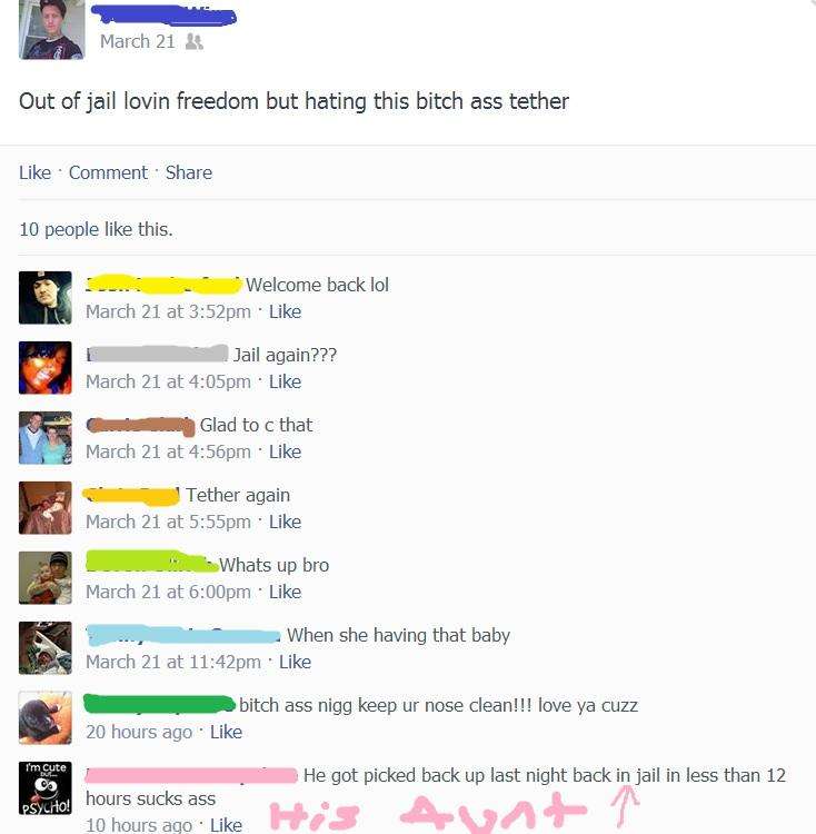 That didn’t last long. He was out for 12 hours with that “bitch-ass” tether before quickly running afoul of the law. By the looks of these comments, I’d guess he tore it off. That’ll make the cops come quick.