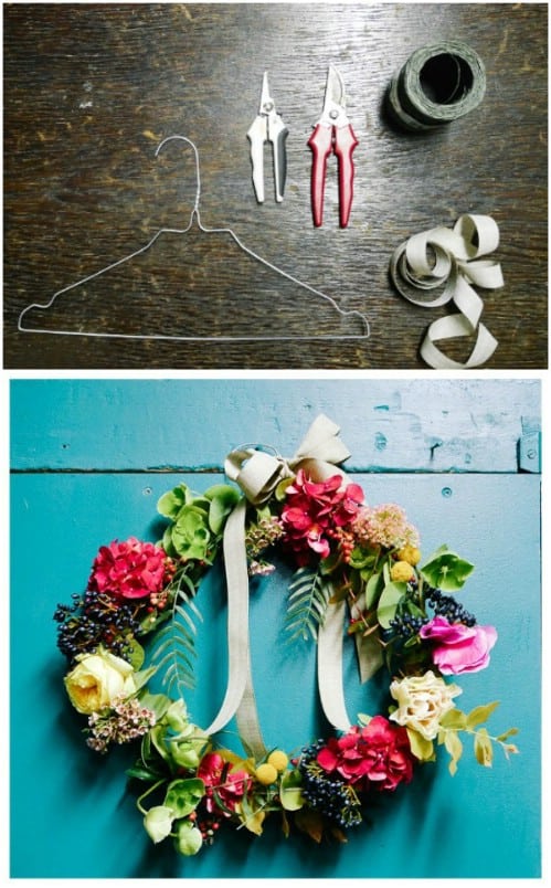 A wire hanger makes the perfect base for a beautiful floral wreath that will look great hanging up in your house. To make this wreath, first shape the hanger into a circle. Then, wrap decorative leaves around the wreath. Glue on your favorite fake flowers, and then let the wreath dry. Then, hang it up wherever you’d like in your house.