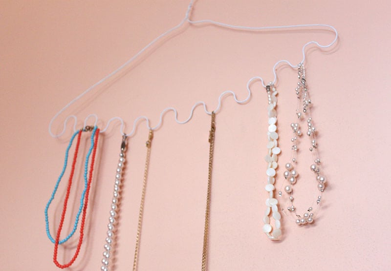 A spray-painted wire hanger can make a great organizer for all of your favorite pieces of jewelry. To make this organizer, you’ll need a clothes hanger, 12-gauge wire, and pliers. You’ll also need something small and round to help shape the organizer—nail polish works well for this. For the full tutorial for this easy organizer, head here.