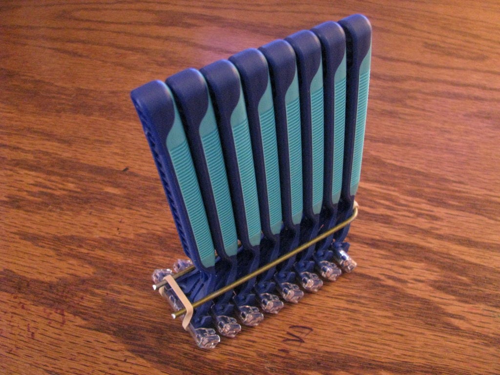 Using a wire hanger and a rubber band, you can easily create a great organizer for your disposable razors. Cut out a section of the wire hanger, and then bend the wire into a U-shape using pliers. Then, attach the rubber band, and secure it using a lark’s foot knot. Place the razors on top of the rubber band, and store them wherever you’d like.