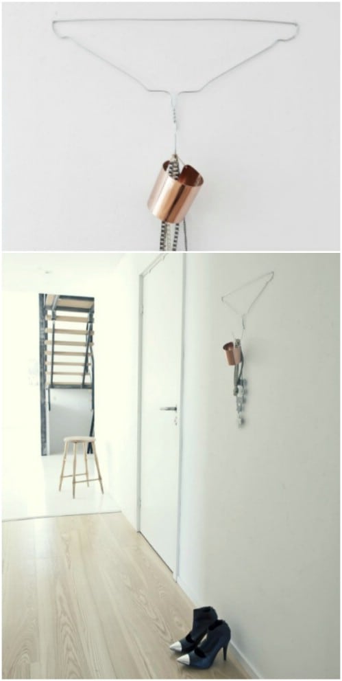 Using a white coat hanger, you can create a fun and funky entryway holder! Hang the coat hanger upside down on your entryway wall. Then, attach any decorations you’d like to the hook portion of the hanger. You can use this hanger to hold your keys, scarves, or any other item you usually grab right before leaving the house.