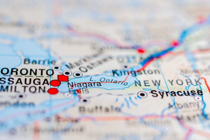 One side of Niagara Falls is in New York State, while the other is in Ontario, Canada (near to Toronto).