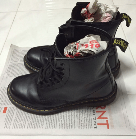 After a rainy day in your boots, the chances are rather high that there will be some moisture left. Grab a couple of old newspaper pages (or paper towels) to keep your boots nice and dry.